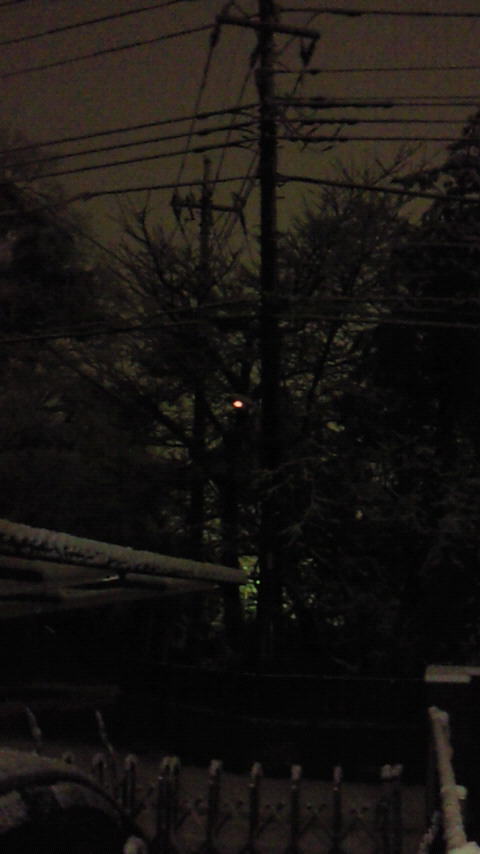雪が降ってるから夜になっても外がほの明るいです。おまけに電柱の街灯がきれかかって光が赤くユラユラ揺れています。