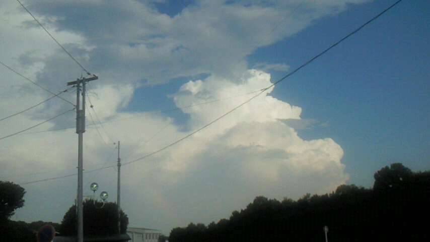 雨が止んだら入道雲が東の空に浮かんでた。よく見たら虹がうっすらと出ていたので写真を撮った。見えるかな?
